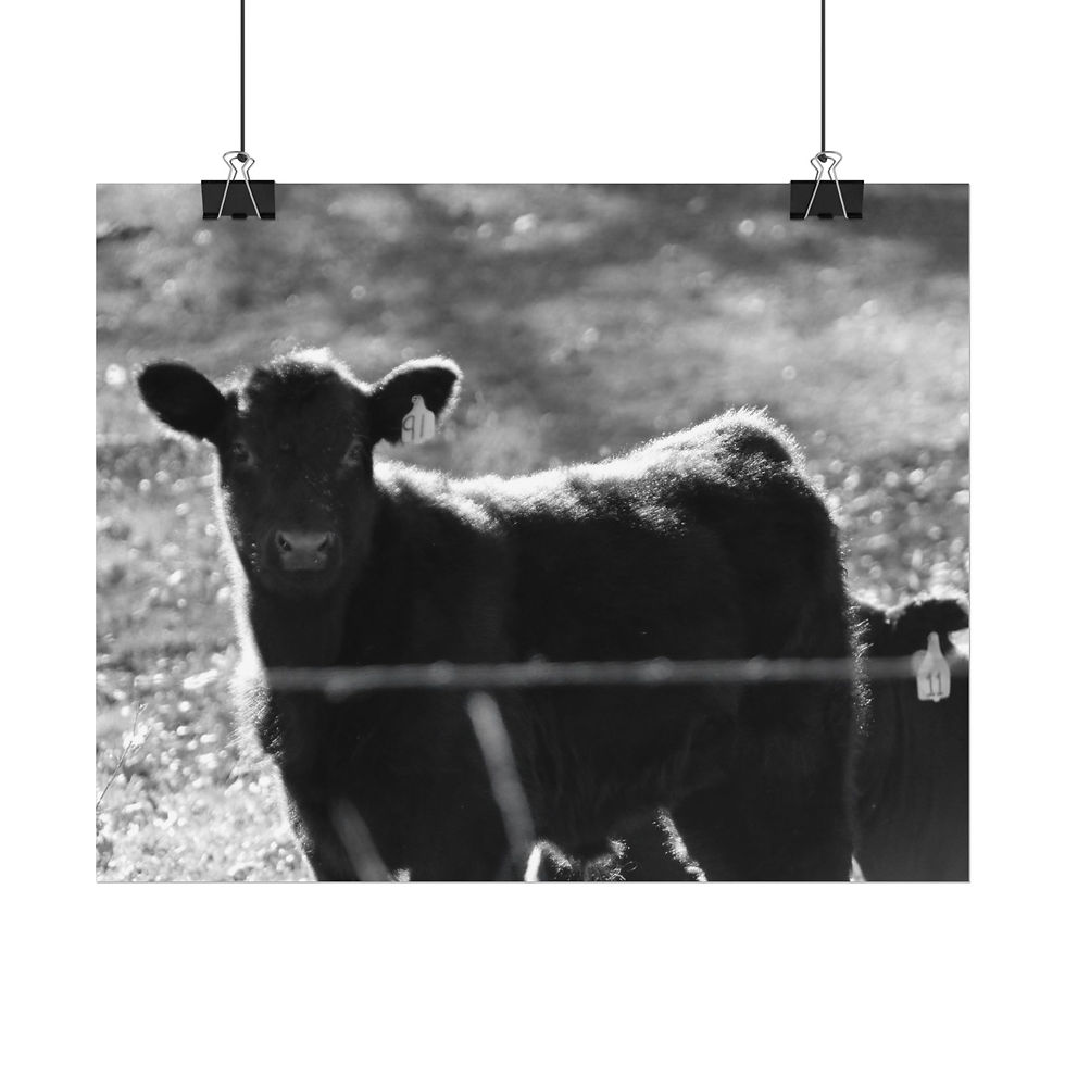 Black & White Young Cow in Field Photography Poster Print